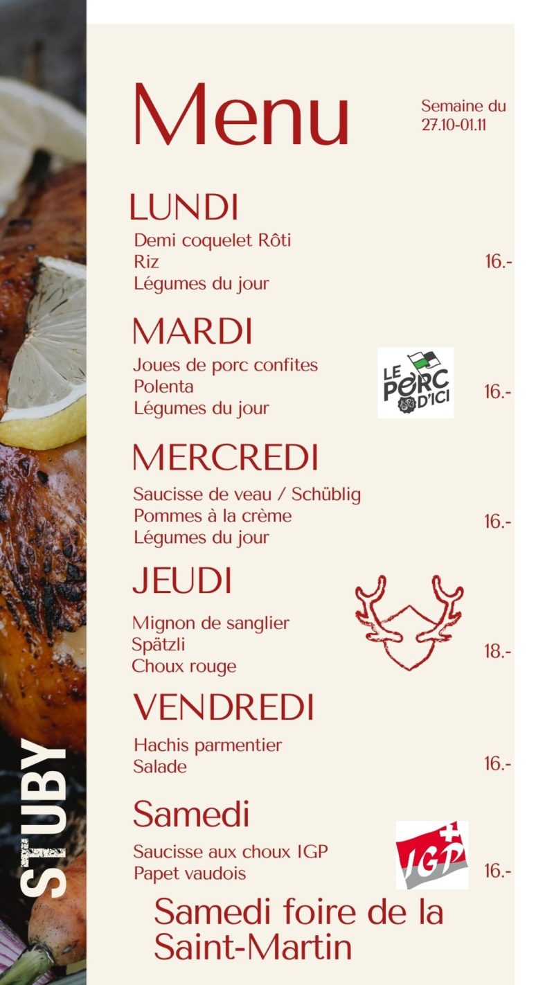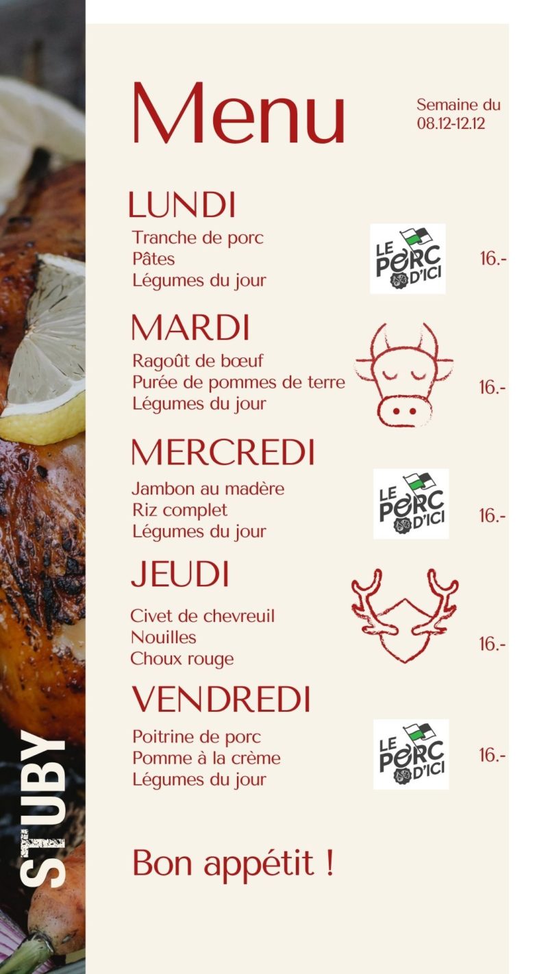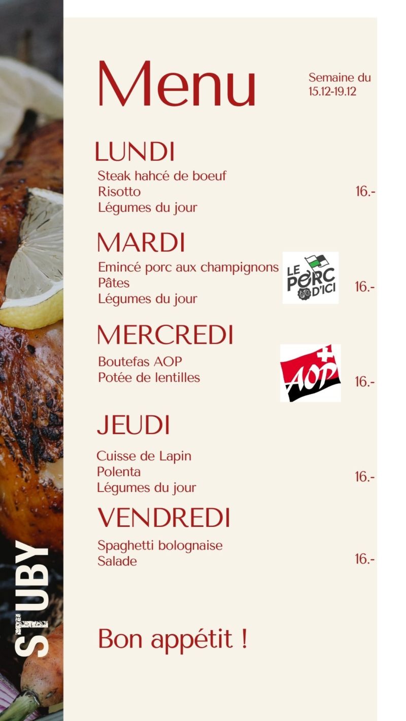 Chez Stuby, chaque semaine notre cuisinière maison vous propose une cuisine familiale équilibrée et variée : tous les jours un menu chaud différent, diverses salades, des canapés, des salés, etc. À déguster à midi lors de votre pause au travail, ou le soir de retour chez vous !