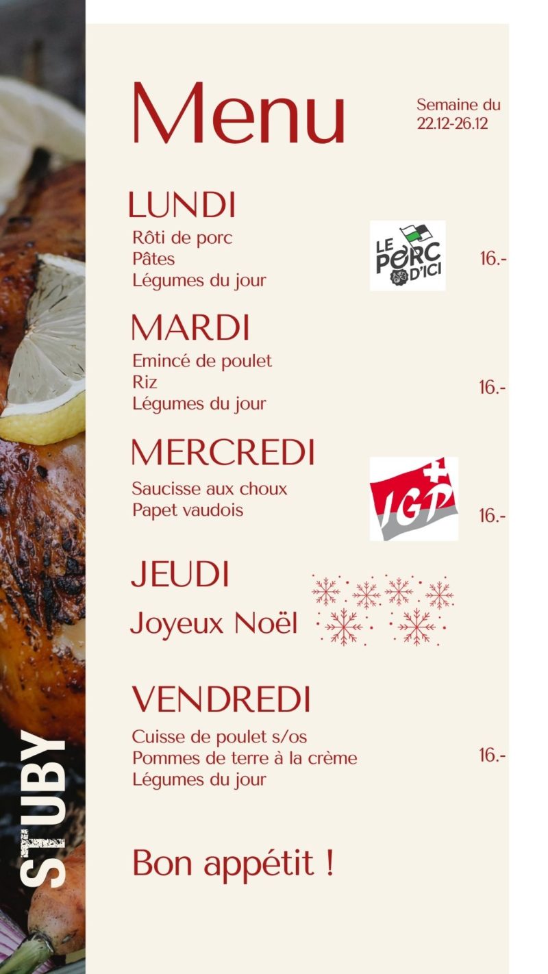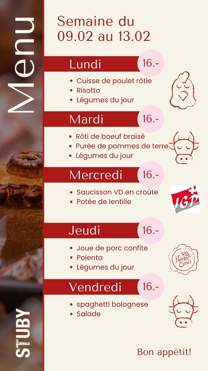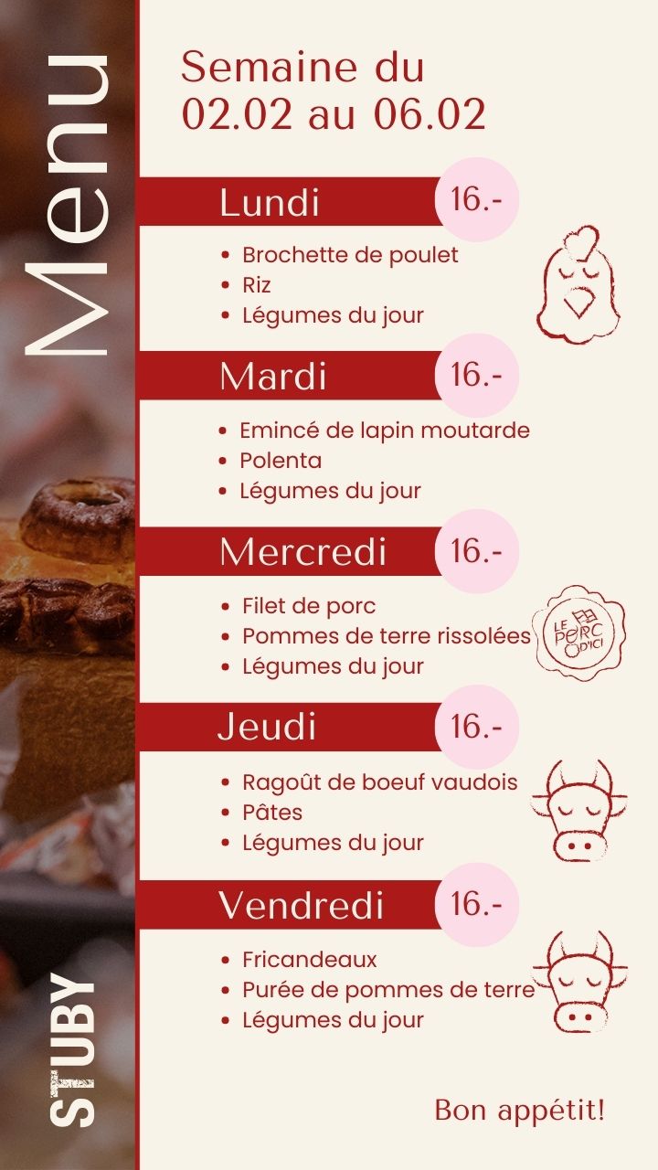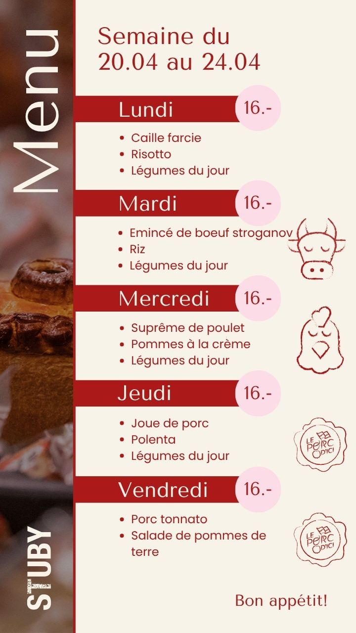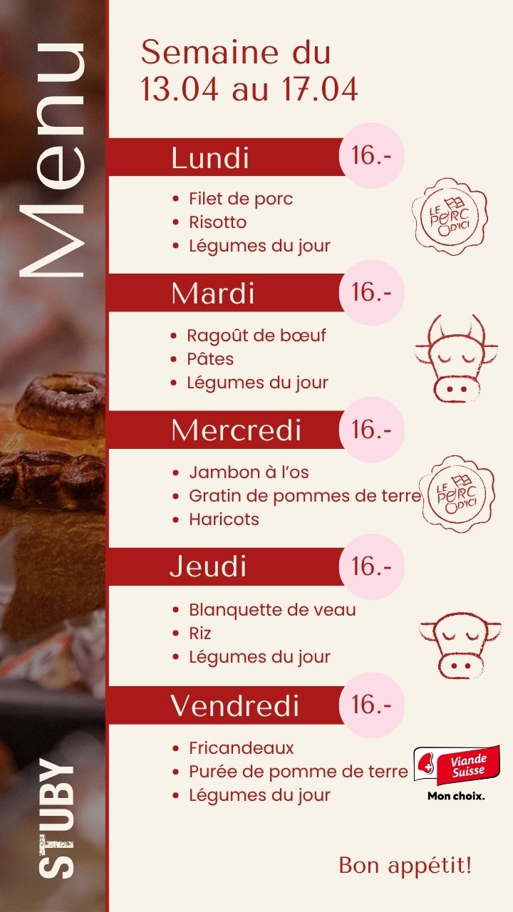 Chez Stuby, chaque semaine notre cuisinière maison vous propose une cuisine familiale équilibrée et variée : tous les jours un menu chaud différent, diverses salades, des canapés, des salés, etc. À déguster à midi lors de votre pause au travail, ou le soir de retour chez vous !